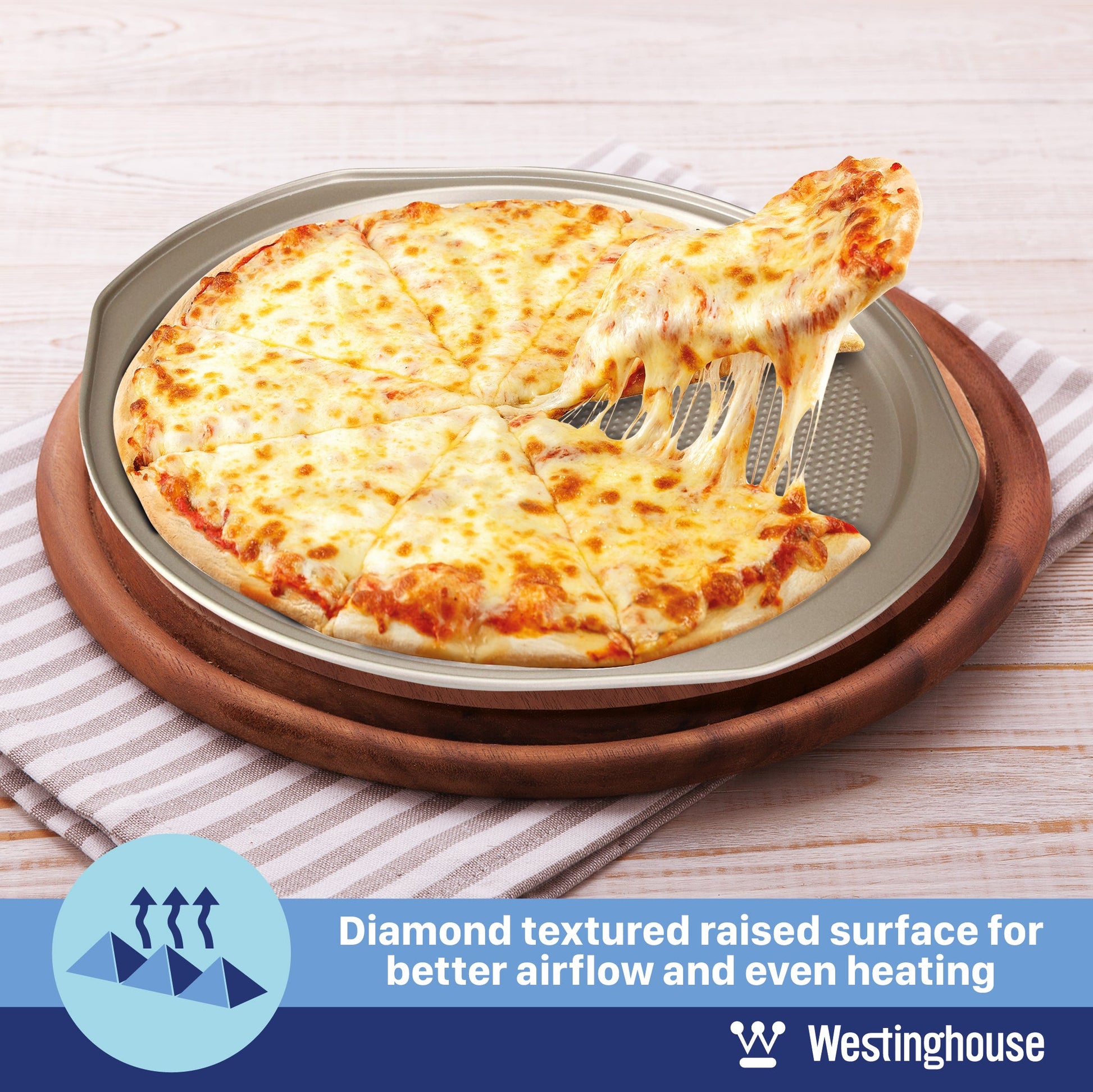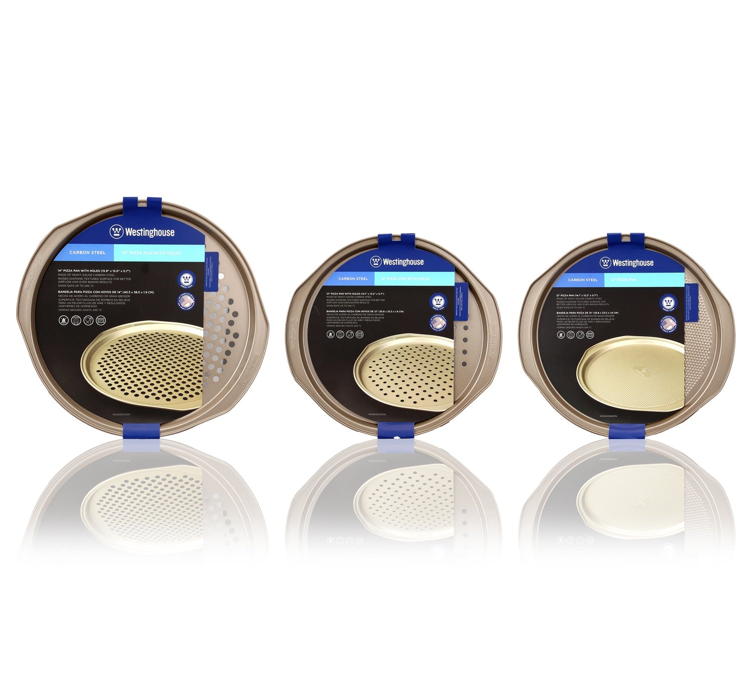 The WESTINGHOUSE versatile bakeware set is the newest addition to our cookware line. This 3-pc nonstick bakeware set will help you bake without any fuss. Its made from 0.8mm heavy duty carbon steel that is designed not to warp or bend out of shape. The textured finish allows for a well balanced heat ensuring amazing baking results every time. Bake amazing pizzas, calazones, apple tartans, croissonts, etc. The superior non-stick coating makes for an easy clean up.