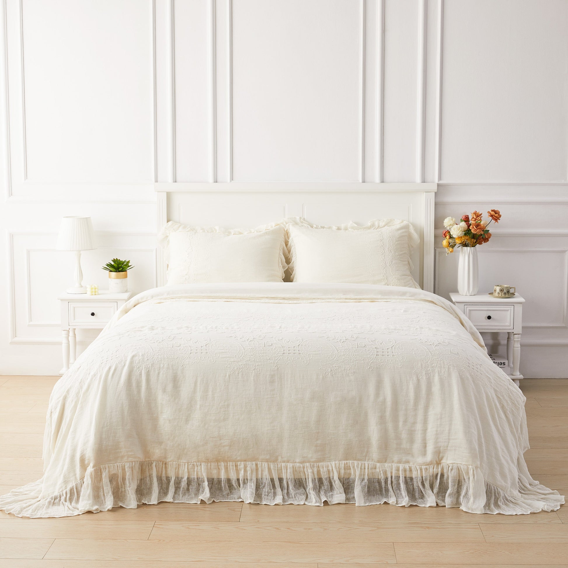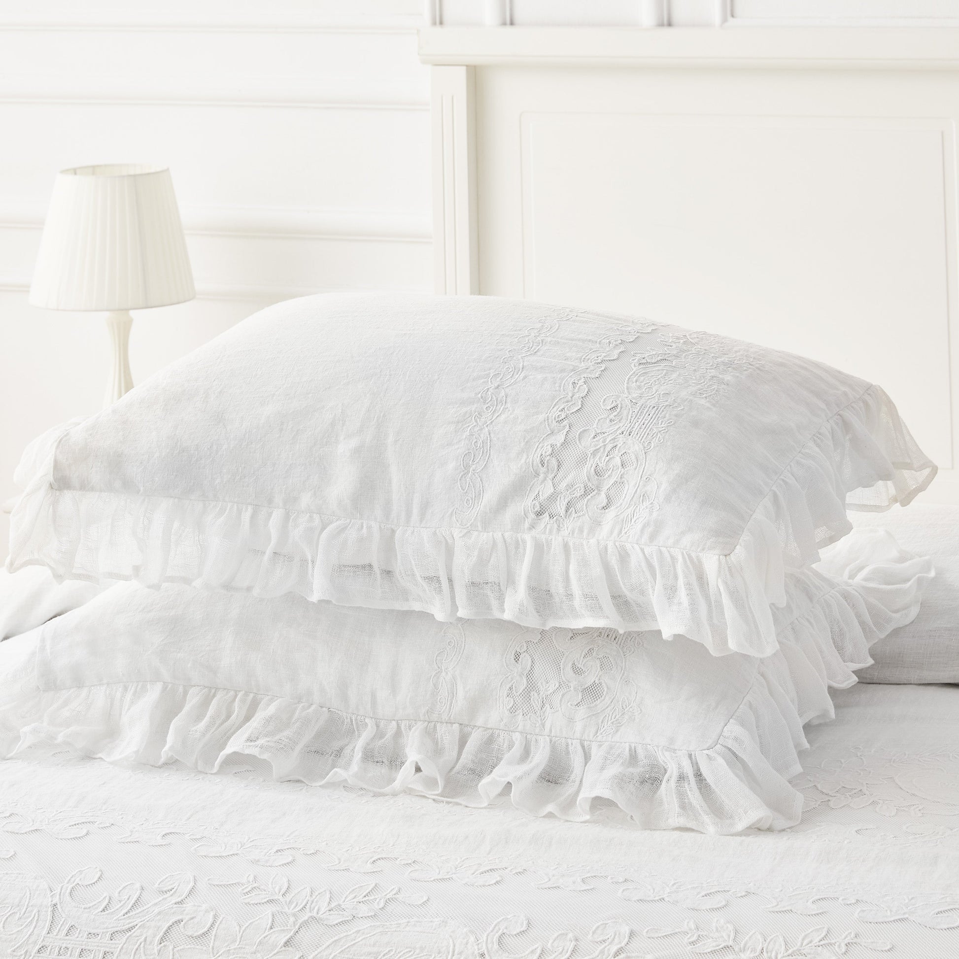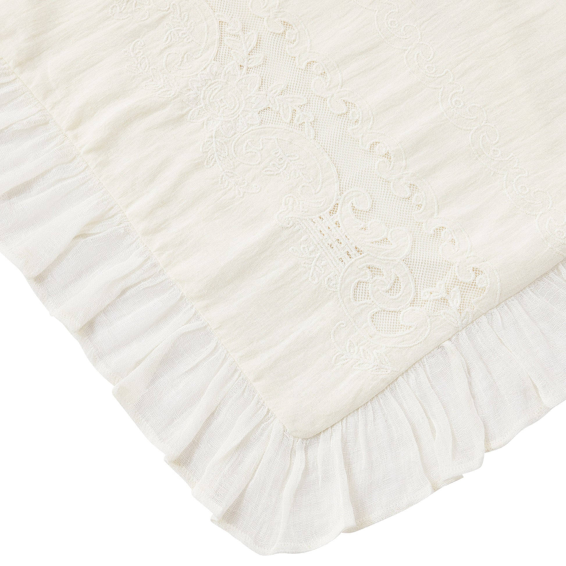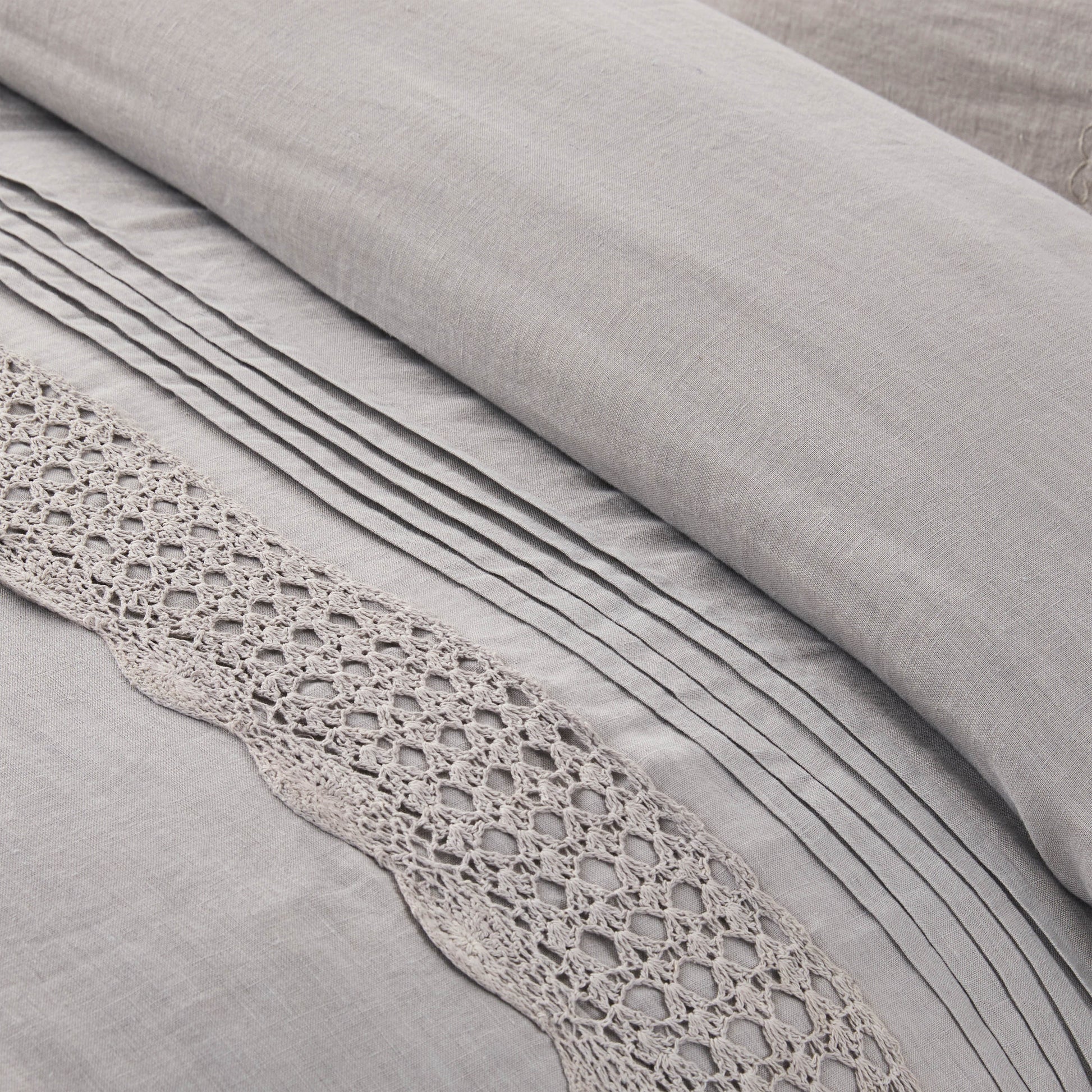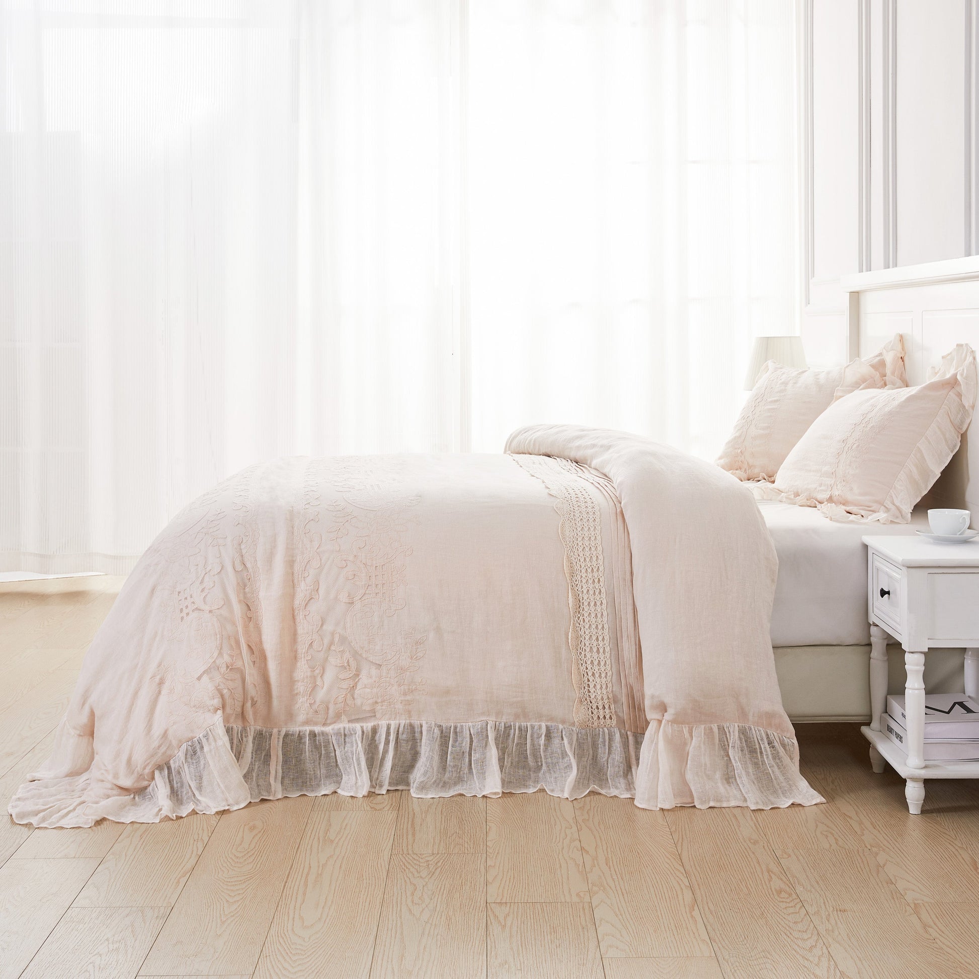 Our Tabitha Linen duvet cover set is casual elegance at its finest. Handcrafted with a linen applique overlay, crochet and pleat detailing, and a voile ruffle border, this duvet set is simply incredible. Linen is breathable, durable and softens with every wash.